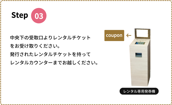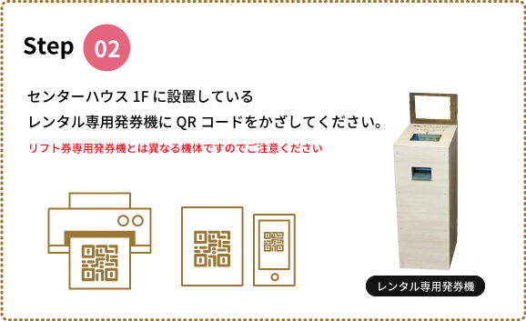 リフト券用の自動発券機、レンタル・フルパック用の自動発券機がございます。別々にございますので、購入商品に合わせた発券機をご利用くださいませ。